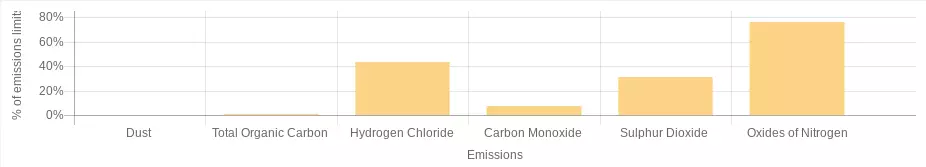 Dust (Particulates) 5mg/m3, Total Organic Carbon 10mg/m3, Hydrogen Chloride 8mg/m3, Carbon Monoxide 50mg/m3, Sulphur Dioxide 40mg/m3 and Oxides of Nitrogen 180mg/m3. Ammonia 15mg/m3